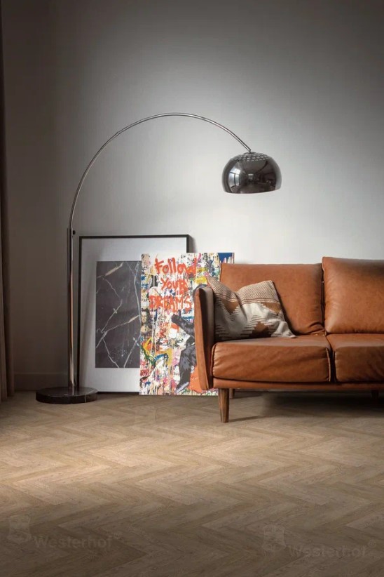 Ламинат 34 класса Westerhof Bellini - роскошное напольное покрытие, имитирующее деревянный укладку паркета в узор "английская ёлочка". Благодаря тиснению в регистр, покрытие достоверно имитирует натуральное дерево. Левый и правый замок-система замков А и В. Размер: 603*100.5*12 мм.