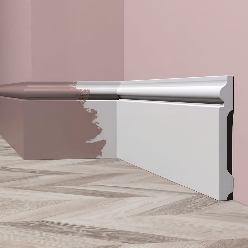 Напольный плинтус Солид UHD 04/120 под покраску, из долговечного и прочного полимера высокой плотности, устойчивого к появлению царапин и не деформирующегося под воздействием влаги. Размер: 2400*15*120 мм.
