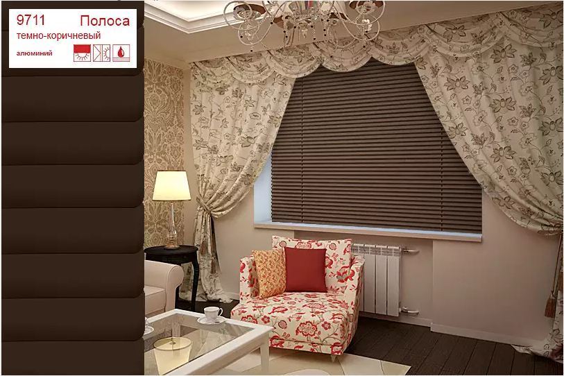 Темно-коричневые (арт. 9711) жалюзи - универсальный аксессуар, подходящий для любых стилей. Он сделает любое помещение более строгим и стильным, а так же выгодно будет сочетаться с более светлыми деталями интерьера.